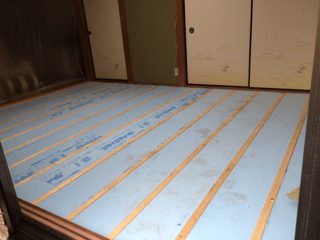 畳の下には基本的に断熱材が入っておらず、寒いのがお悩みという事でしたので、新たな下地(根駄)の間に断熱材を入れました。