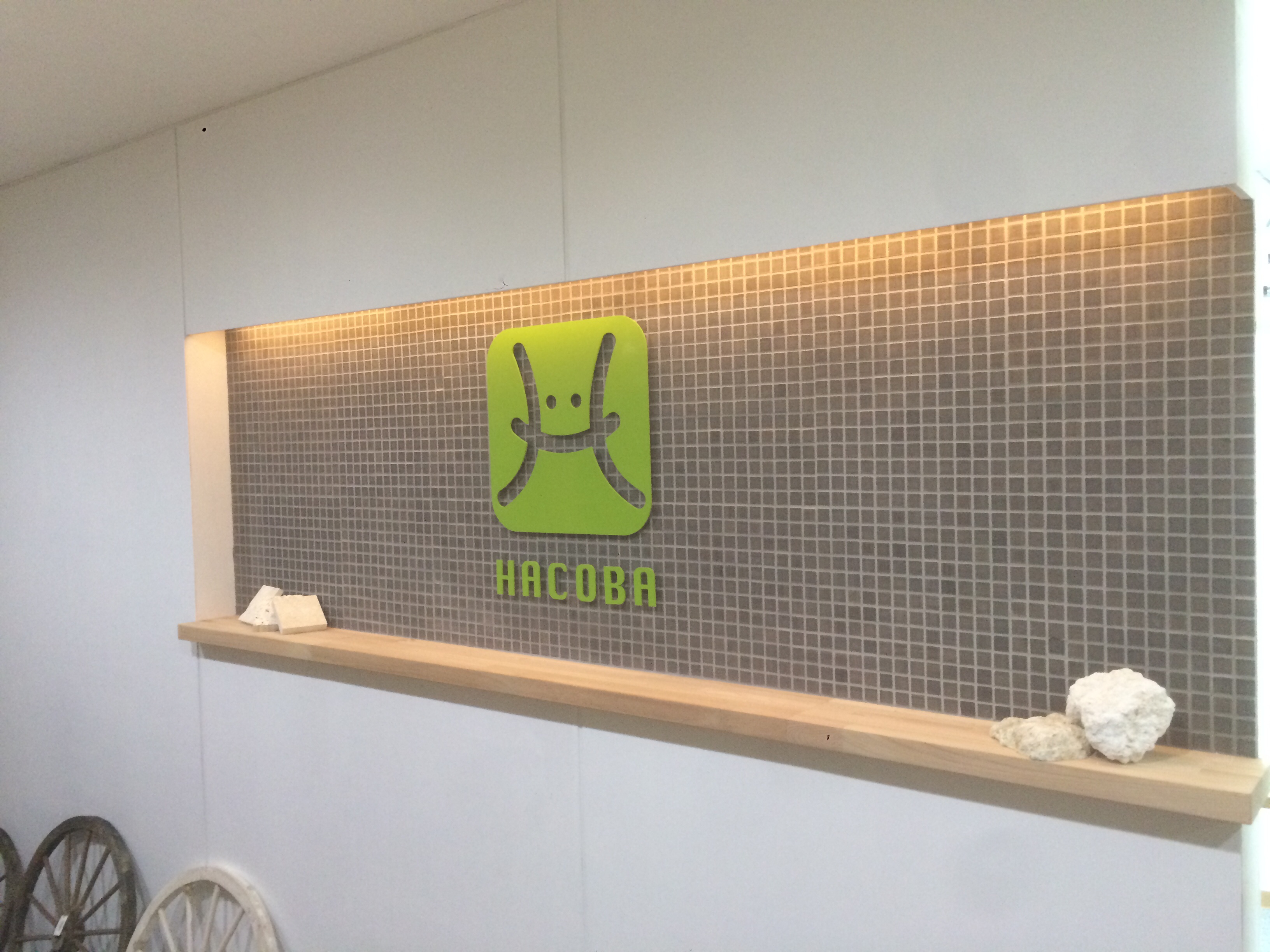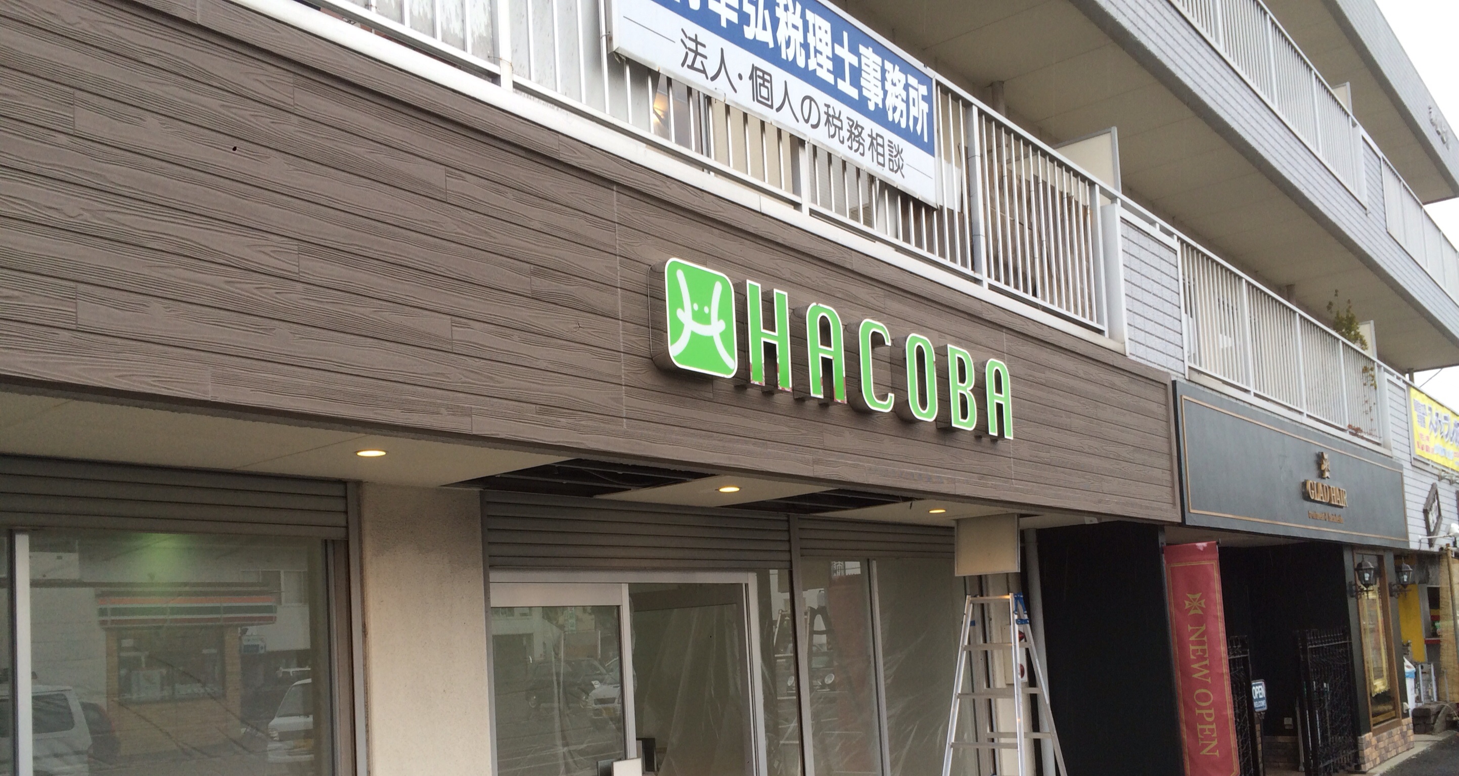 看板を取り付ける部分にサイディングで下地も作らせて頂きました。 茶色い木目調で、HACOBAのロゴとマッチしています。