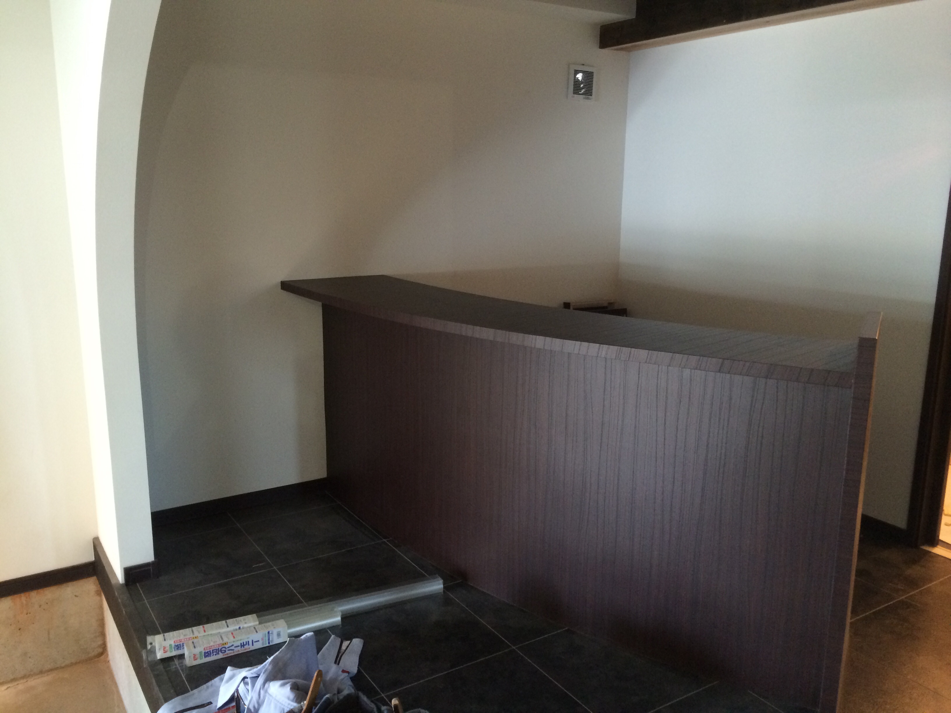 先日ご紹介しました、完全オーダーメイドのアールのバーカウンターですが、ダイノックフィルムの施工が完了しました。 全体の色と同じようなダークブラウンのシートで仕上げています。