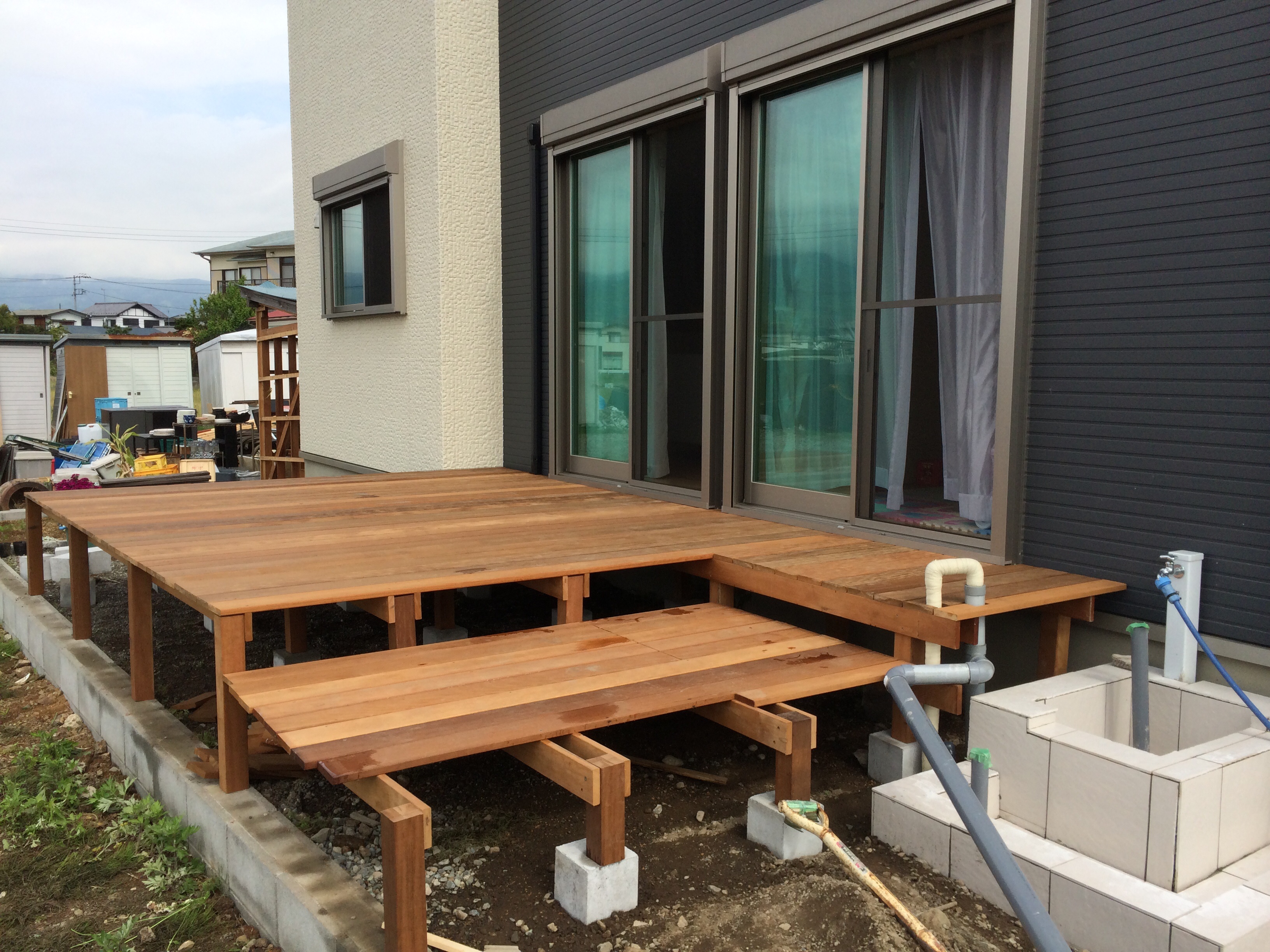 材料はイタウバです。 イタウバは世界最強の耐久性と言われるウリンと同じクスノキ科の材料で、耐久性や施工後の割れなどの心配も少ないながらコストはウリンの約3/4というコストパフォーマンスの高い材料で、弊社ではおすすめしています。