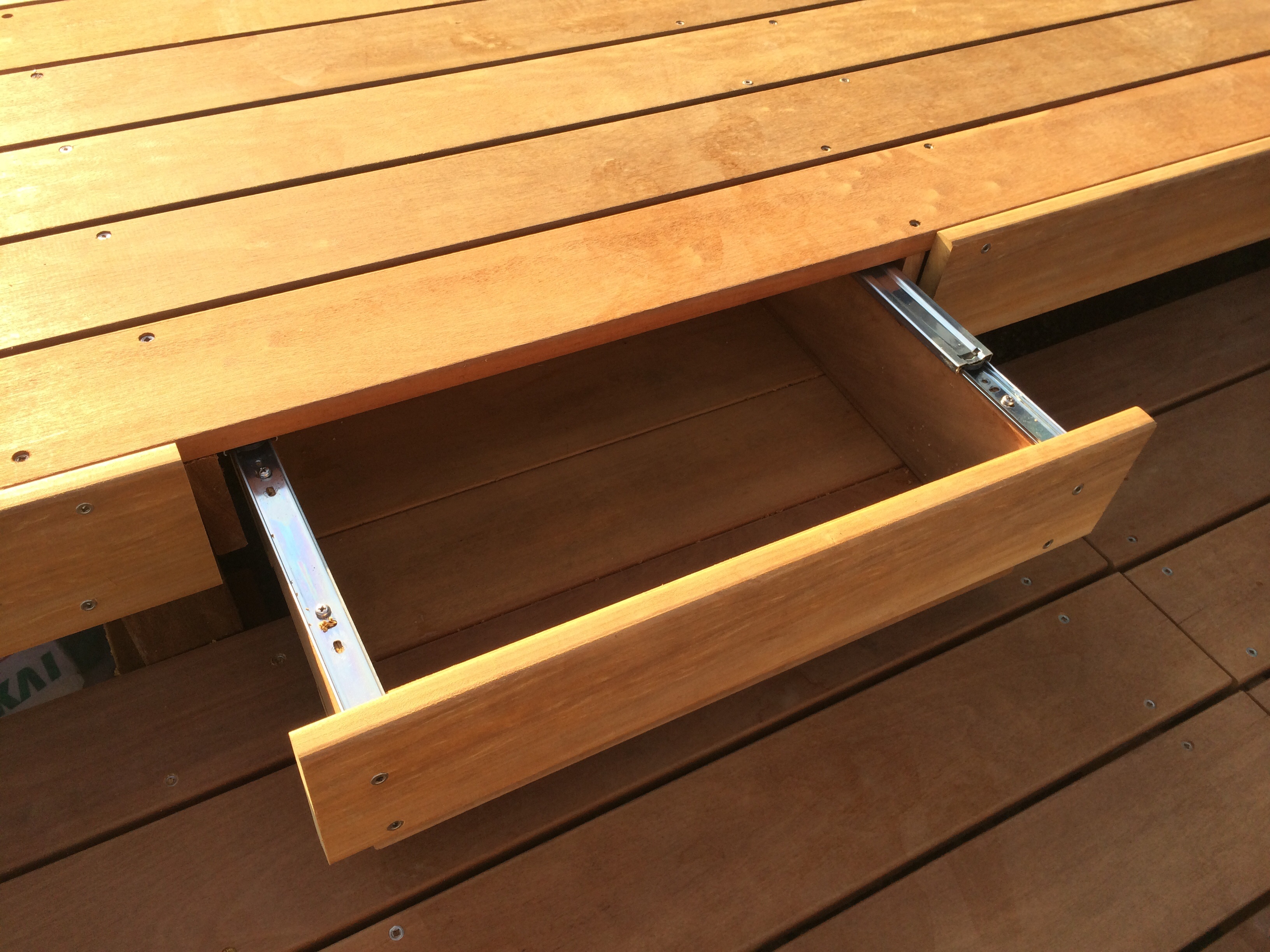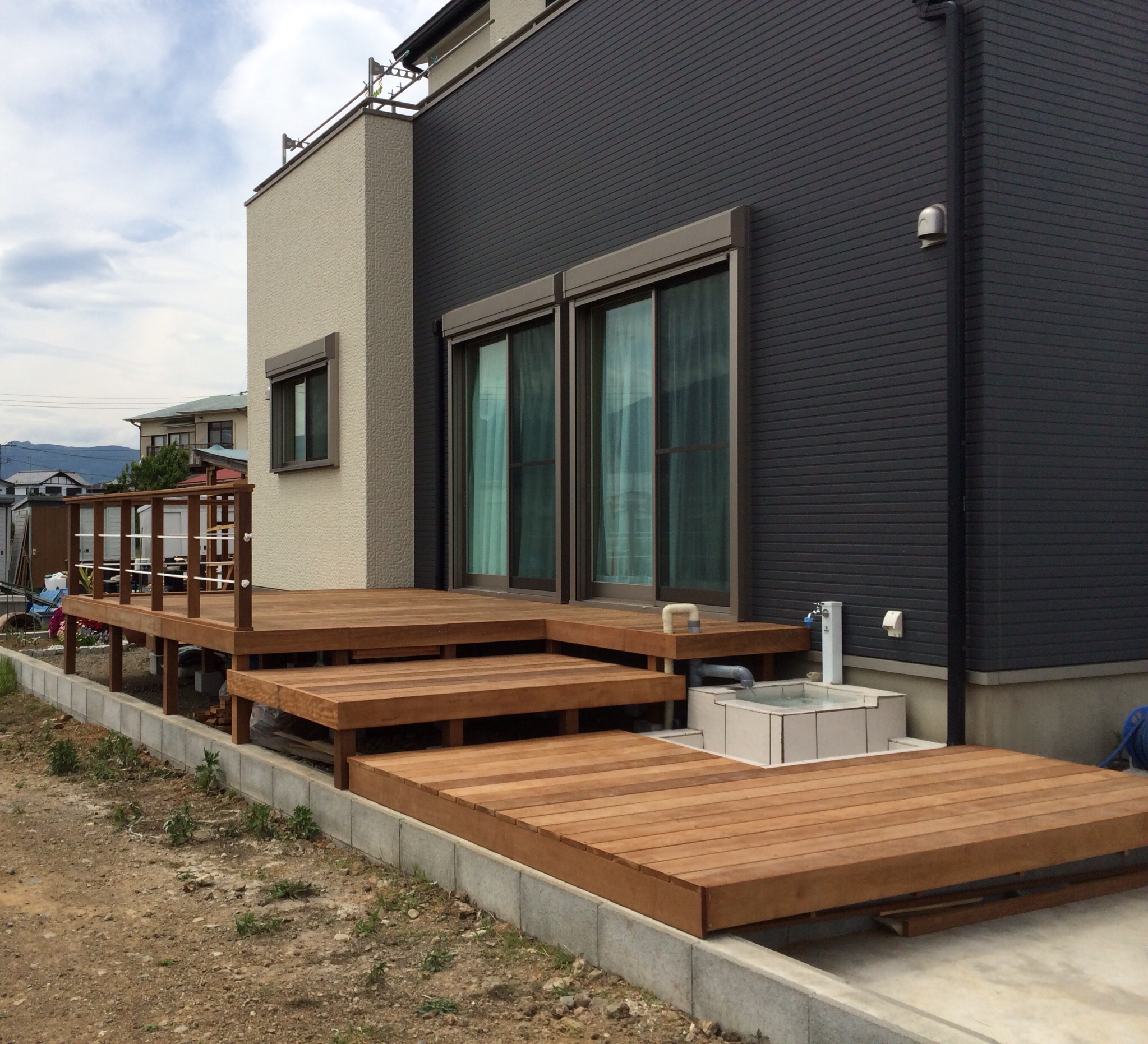 1段目は井戸舟を囲う様に作り、デッキに腰をおろして足をつけたり、野菜を洗ったりと、余裕を持った広さに、階段というよりは踊り場というべき2段目、こちらは小物を収納できる引出し付きです。