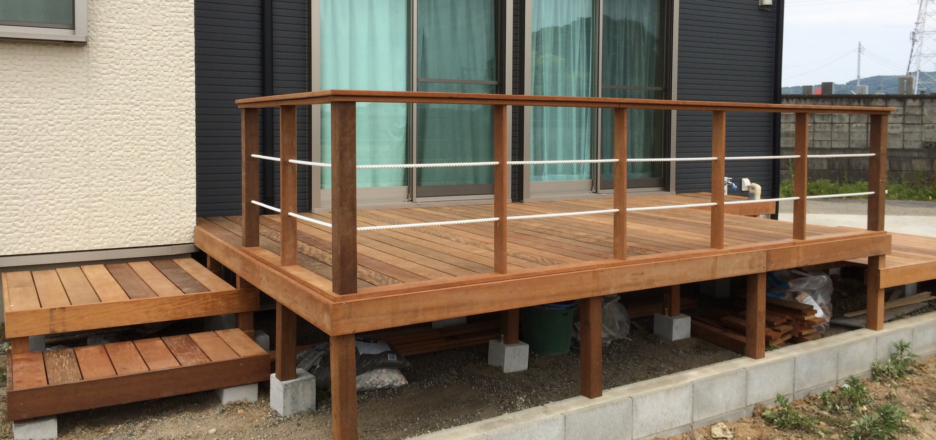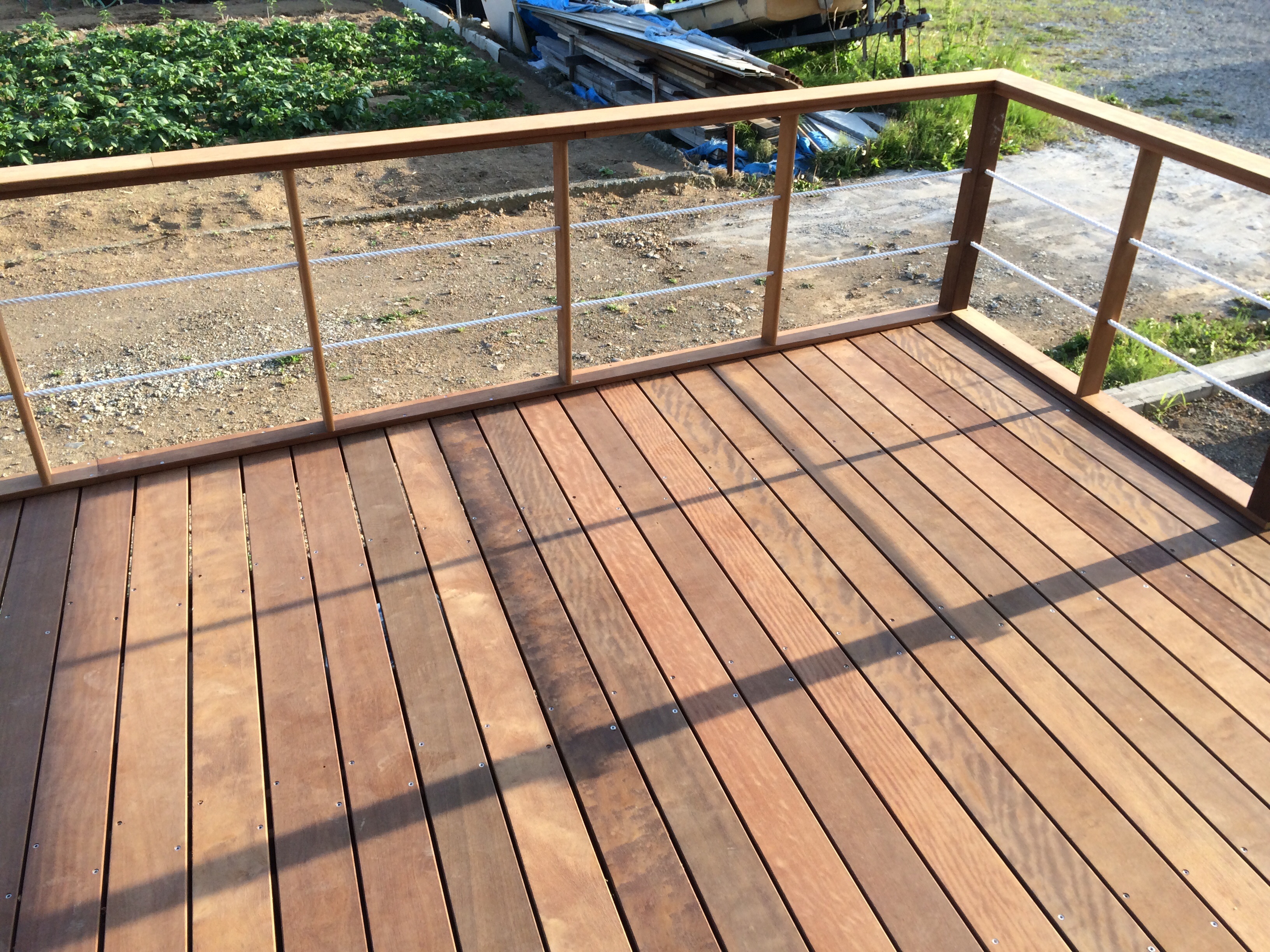 ウッドデッキの規模としては大きいですが、ハードウッドの中でもコストパフォーマンスの高いイタウバ材にする事でできるだけ費用を抑えて施工する事ができました。